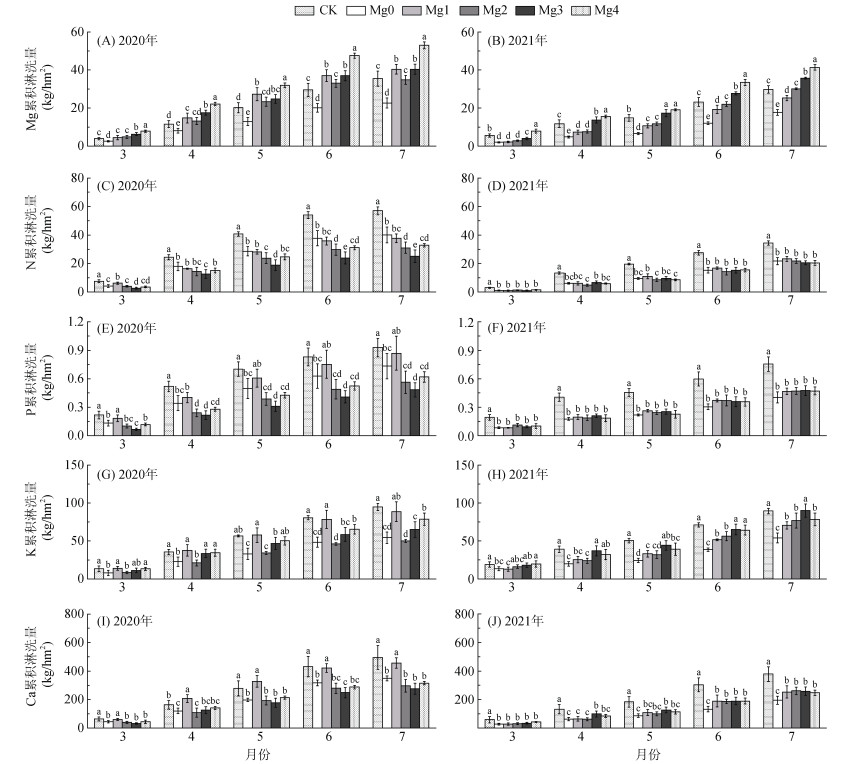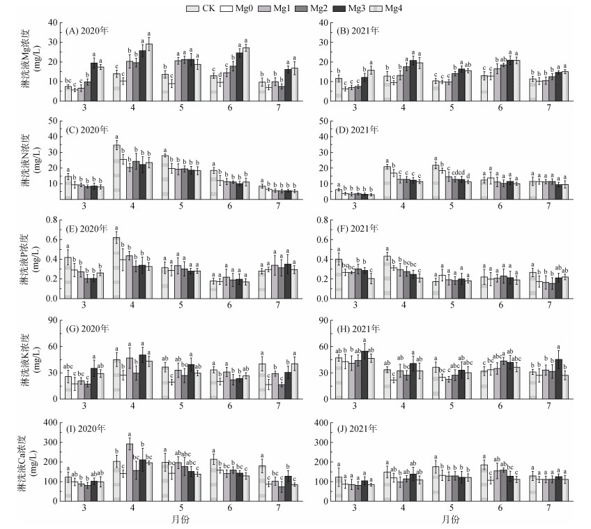 2 结果与分析 2.1 不同施肥处理下土壤Mg、N、P、K和Ca淋失特征在冬瓜的生长期内,淋洗液N、P、K和Ca浓度均呈先增加再降低的变化规律,而淋洗液Mg浓度分别在4月和6月出现两次峰值(图 3)。2020年和2021年土壤淋洗液Mg浓度均随施Mg量的增加而逐渐增加,淋洗液Mg浓度最大值均出现在施肥后(图 3A, 3B)。2020年5月和6月Mg0处理淋洗液Mg浓度较CK处理显著降低34.62% 和26.76%,而在2021年3月和4月Mg0处理淋洗液Mg浓度分别较CK处理显著降低了45.51% 和26.24%。与Mg0处理相比,2020年和2021年Mg1、Mg2、Mg3和Mg4处理淋洗液Mg浓度平均增加17.84% ~ 129.82%、43.42% ~ 137.15%、44.23% ~ 243.77%、47.71% ~ 206.58%。化肥减量后(Mg0)土壤淋洗液中N浓度在3月、4月和5月显著降低,与常规施肥处理(CK)相比分别降低35.98% ~ 40.39%、19.50% ~ 26.33% 和15.42% ~ 29.33%(图 3C,3D)。2020年Mg0 ~ Mg4处理之间的N浓度无显著差异;2021年4月和5月,Mg1 ~ Mg4处理淋洗液N浓度显著降低,与Mg0处理相比降低15.42% ~ 38.85%。Mg0处理显著降低3月和4月淋洗液中的P浓度,与CK处理相比分别降低30.84% ~ 33.55% 和27.80% ~ 36.33%(图 3E,3F)。与CK处理相比,Mg0处理土壤淋洗液中K浓度平均降低了31.74% ~ 47.31%;随着镁肥用量的增加,土壤淋洗液中K含量逐渐增加(图 3G,3H)。与CK相比,Mg0处理土壤淋洗液中Ca浓度明显降低,在2020年4月、5月、6月和7月分别较CK处理降低了30.75%、28.07%、25.92% 和51.40%,在2021年5月和6月分别较CK处理降低了24.71% 和42.49%(图 3I,3J)。