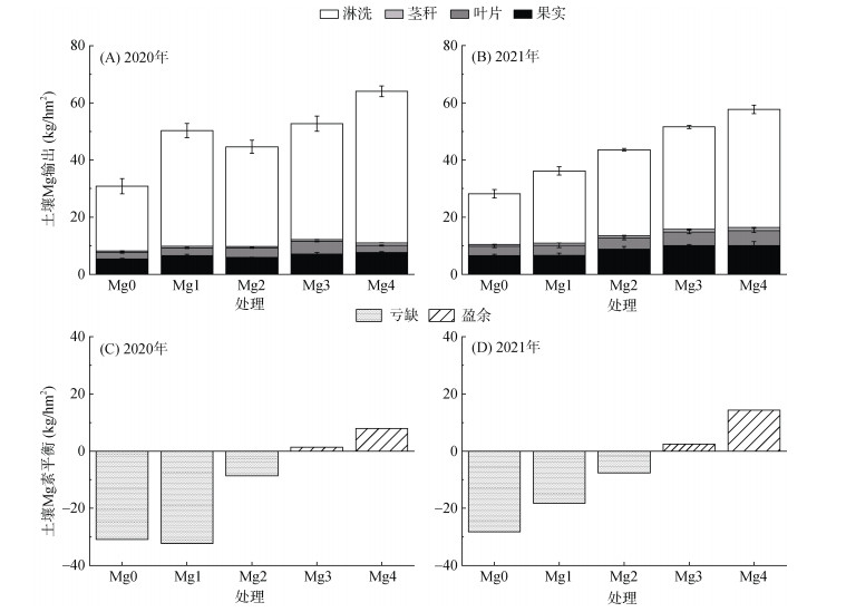 2.3 不同镁肥用量下冬瓜主产区土壤Mg输出与平衡淋洗损失是华南冬瓜主产区土壤Mg输出的主要途径,随着施Mg量的增加,淋洗损失和作物(果实、叶片和茎秆)带走Mg素逐渐增加(图 5A,5B)。2020年Mg0、Mg1、Mg2、Mg3和Mg4处理下土壤Mg总输出量分别为30.84、50.26、44.59、52.70和64.03 kg/hm2,其中淋洗损失分别占土壤Mg输出总量的73.33%、80.48%、78.11%、76.81% 和82.80%;2021年Mg0、Mg1、Mg2、Mg3和Mg4处理下土壤Mg总输出量分别为28.21、36.19、43.63、51.55和57.68 kg/hm2,其中淋洗损失分别占土壤Mg输出总量的62.85%、69.80%、69.06%、69.41% 和71.64%。