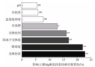 (图中*、**分别表示影响达P < 0.05和P < 0.01显著水平,ns表示影响不显著) 图 6 基于随机森林相对重要性模型分析土壤Mg淋洗主要影响因素 Fig. 6 Influencing factors of soil Mg leaching based on relative importance model of random forest |