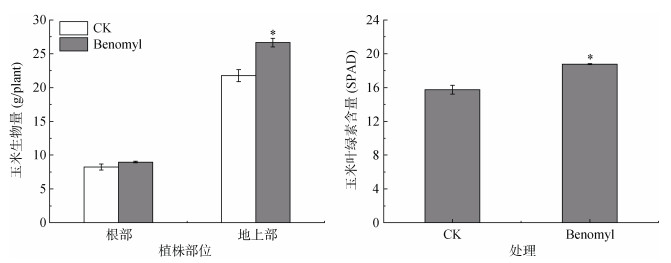 与CK相比,施苯菌灵处理,玉米叶片叶绿素含量增加19.21%,地上部生物量增加22.54%,根系生物量没有显著变化(图 1)。可见,施苯菌灵促进了玉米的生长。