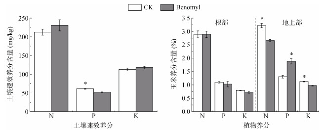 施苯菌灵处理土壤有效磷含量降低17.19%,土壤碱解氮、速效钾没有显著变化(图 2);玉米地上部全氮和全钾含量分别降低17.39% 和13.65%,全磷含量增加44.13%,根部养分含量没有显著变化(图 2)。