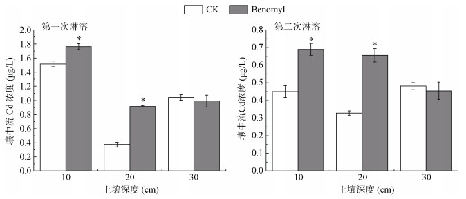 本次试验共收集了两次壤中流(10、20和30 cm),施苯菌灵处理两次10 cm和20 cm壤中流Cd浓度均显著上升,增幅为16.32% ~ 144.77%,并且两次20 cm壤中流Cd浓度增幅均大于10 cm壤中流Cd浓度;30 cm壤中流Cd浓度均没有显著变化(图 3)。可见,施苯菌灵会导致10 cm和20 cm壤中流Cd浓度增加。