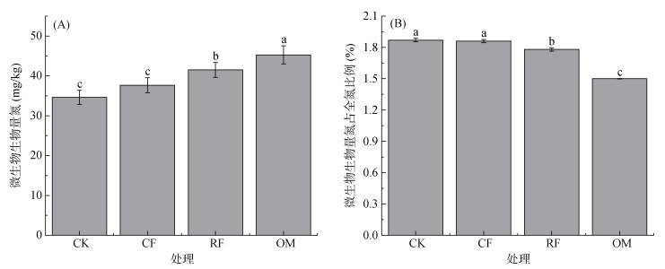 土壤微生物生物量氮占全氮的比例在不同施肥处理间的变化如图 1B所示。结果表明,各施肥处理的土壤微生物生物量氮占全氮的比例与微生物生物量氮的大小变化顺序相反。CK和CF处理的微生物生物量氮占全氮的比例均显著(P<0.05)高于RF和OM处理,而RF和OM处理间无显著性差异著。各施肥处理微生物生物量氮占全氮的比例大小顺序表现为CK>CF>RF>OM。