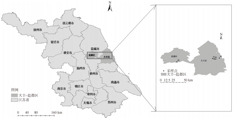 1 材料与方法 1.1 研究区概况研究区位于江苏省盐城市大丰区和盐都区,位于32°56′N ~ 33°36′N、119°40′E ~ 120°13′E,大丰区海拔为1.8 ~ 4.5 m,盐都区海拔为1.5 ~ 2.2 m,全境为平原地貌,天然河网对水的调蓄能力有限,汛期降水形成的径流很快排泄入海,本地径流利用率很低。非汛期水源紧缺,每年5月中旬至6月下旬正值灌溉期,缺水较严重。两区位于江苏省盐城市中部地区,均属亚热带季风气候,冬季受欧亚大陆冷气团影响,盛行偏北风且多寒冷天气;夏季受太平洋副热带高压影响,盛行偏南风且多炎热天气,空气温暖而湿润,雨水丰沛。