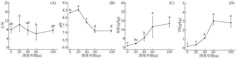 SOC和TN含量随围垦年限增加均出现上升趋势,大致均可分为3个时期(图 2C、2D)。第一个时期,SOC和TN从0 a围垦至20 a左右均无显著性增加;第二个时期,SOC从20 a左右围垦至40 a左右无显著性增加,而TN显著性增加,从40 a左右围垦至60 a左右SOC和TN含量均显著增加;第三个时期,从围垦60 a左右至围垦100 a以上时,SOC含量和TN含量总体趋于稳定。