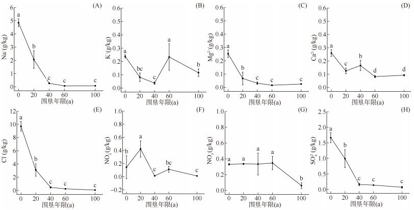 图 3 表层土壤盐分离子随围垦年限的变化特征 Fig. 3 Changes of salt ions variations of surface soils following reclamation |