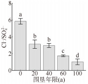 滨海盐渍土围垦过程伴随着盐分离子含量的相对变化,本研究选择Cl–/ SO42–作为滨海盐渍土阴离子相对含量变化指标,主要因为Cl–、SO42–在阴离子中占比较高,并且他们的比值可以反映盐渍土的盐分类型。本研究中随着围垦年限增加,盐分组成也在发生着变化,主要原因是Cl–含量下降较快,而SO42–含量相对稳定,从而导致Cl–与SO42–比值随围垦年限增加显著性降低,盐分组成由氯化物盐土向硫酸盐盐土转化。