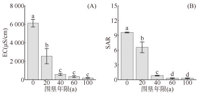 图 5 不同围垦年限下表层土壤EC(A)、SAR(B)变化特征 Fig. 5 Changes of EC (A) and SAR (B) of surface soils following reclamation |