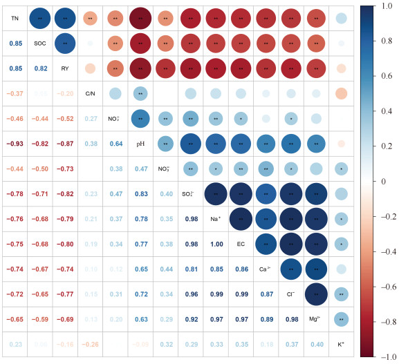(*、** 分别表示相关性达P < 0.1和P < 0.05显著水平) 图 6 土壤理化性质及离子间相关性 Fig. 6 Correlation relationships between soil physicochemical properties and ions |