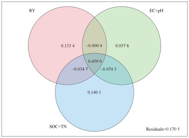 由图 6可知,除K+外,其他大部分盐分离子均与SOC、TN、RY呈显著负相关关系,与pH、EC呈显著正相关关系。于是对不同影响因素进行分组后(图 7),深入讨论土壤表层盐分离子变化影响因素。单因素RY对盐分离子变化的贡献度为0.133 4,表明单因素RY对盐分离子变化有较大的影响。SOC–TN对盐分离子变化的贡献度为0.140 1,说明SOC–TN含量增加对盐分离子含量降低具有一定促进作用,其对盐分离子变化的影响大于单因素RY。pH–EC对盐分离子变化的贡献度为0.057 8,表明土壤的pH和EC降低对盐分离子含量降低具有较显著的影响。RY与SOC–TN的综合贡献度、RY与pH–EC的联合贡献度最小(小于0时按0处理),pH–EC与SOC–TN含量的联合贡献度为0.074 3,说明土壤pH–EC与SOC–TN含量的共同作用对盐分离子变化具有较明显促进作用。3个组分的总体贡献度为0.459 0,说RY、SOC–TN以及pH–EC这3组因素对盐分离子变化具有显著的影响。