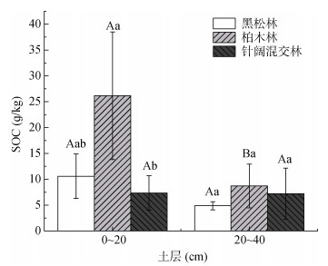 不同土层黑松林、柏木林、针阔混交林的SOC含量如图 1所示。黑松林SOC含量在0 ~ 20和20 ~ 40 cm土层依次为10.58和4.87 g/kg,针阔混交林的含量在7.22 ~ 7.34 g/kg。在0 ~ 20 cm土层中,不同植被类型间SOC含量差异显著(P < 0.05),表现为柏木林 > 黑松林 > 针阔混交林。在20 ~ 40 cm土层中,不同植被类型间SOC含量差异不显著。柏木林的上、下土层SOC含量差异显著(P < 0.05),分别为26.15和4.87 g/kg。黑松林和针阔混交林上、下土层SOC含量均无显著差异,各植被类型0 ~ 20 cm土层SOC含量均高于20 ~ 40 cm土层。