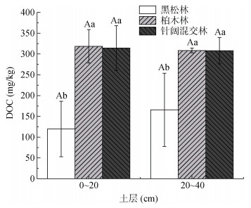 从图 2可知,DOC含量在不同植被类型间差异显著(P < 0.05),在不同土层间差异不显著。柏木林上下土层的DOC含量分别为318.37和308.39 mg/kg,高于其他两种植被类型。针阔混交林与柏木林DOC含量差异较小,在307.98 ~ 314.21 mg/kg。黑松林DOC含量最低,变化范围为119.7 ~ 165.66 mg/kg。柏木林和针阔混交林的DOC含量均随土层的加深而减小,而黑松林的DOC含量随土层的加深而增加。