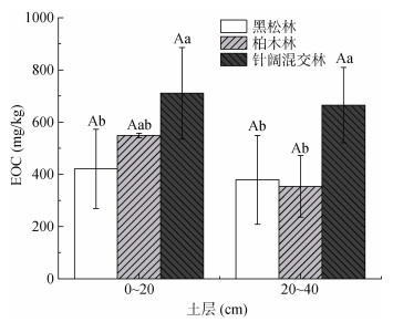 如图 3所示,针阔混交林EOC含量在上、下层土壤中均为最高,分别为710.3和665.28 mg/kg,并与其他植被类型存在显著差异(P < 0.05)。3种植被类型0 ~ 20 cm土层土壤EOC含量均高于20 ~ 40 cm土层,但两土层间并无显著差异。黑松林和柏木林的EOC平均含量变化范围分别为379.07 ~ 421.14、353.99 ~ 548.87 mg/kg。