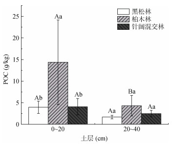 图 4展示了不同土层、不同植被类型的POC含量。黑松林、柏木林和针阔混交林的POC含量均呈现随着土层的增加而减小的趋势,其中柏木林上、下土层POC含量分别为14.37和4.31 g/kg,含量相差较大,差异显著(P < 0.05)。黑松林与针阔混交林POC含量在不同土层间差异不显著,变化范围依次为1.68 ~ 3.94、2.48 ~ 4.08 g/kg。对不同植被类型,上、下土层的POC含量均表现为柏木林最高,在0 ~ 20 cm土层中柏木林显著高于其他植被类型,与黑松林、针阔混交林差异显著(P < 0.05),黑松林和针阔混交林差异不显著,20 ~ 40 cm土层3种植被类型间差异均不显著。