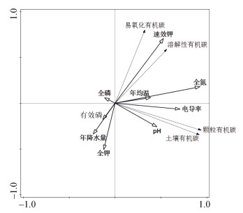 有机碳组分与各因子的二维排序图如图 5所示。土壤碳组分用虚线表示,其他理化因子和气候因子用加粗实线表示。全氮和速效钾这两条线的箭头连线最长,说明这两个因子对土壤碳组分的差异性解释最好。若两个箭头连线之间的夹角为锐角,说明两个指标之间为正相关;若为钝角,则为负相关。从图 5可知,土壤全氮、速效钾、电导率、年均温与SOC及各活性碳组分均呈正相关,土壤pH与SOC、POC、DOC为正相关,与EOC为负相关。全钾与SOC和POC呈正相关,与DOC和EOC呈负相关。有效磷、年降水量与SOC及各活性碳组分均呈负相关,全磷与EOC为正相关,与其他碳组分均为负相关。