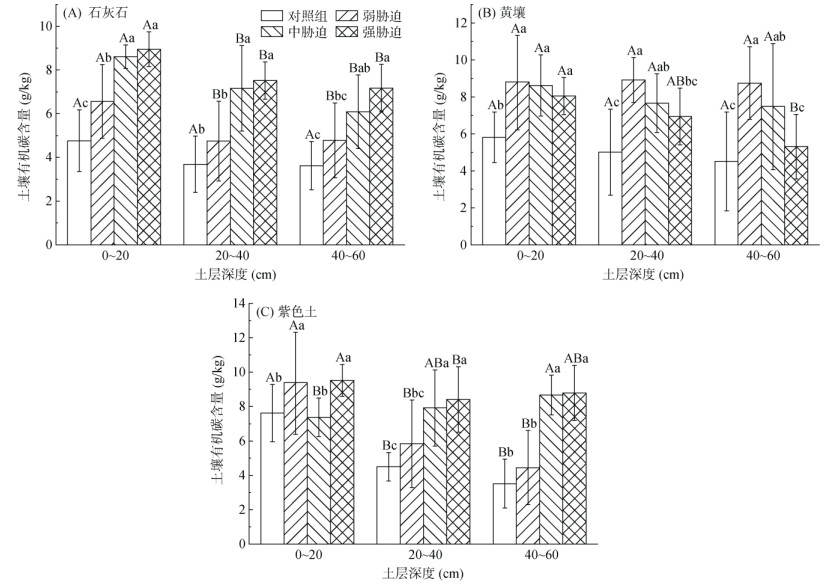 (图中不同小写字母表示同一土层不同水淹胁迫强度间差异显著(P < 0.05),不同大写字母表示同一水淹胁迫强度下不同土层间差异显著(P < 0.05)) 图 1 三种土壤类型在不同水淹条件下的土壤有机碳含量 |
