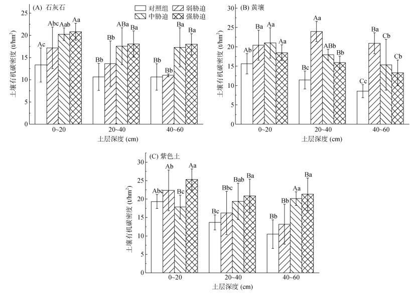研究区石灰土的有机碳密度在各土层随水淹胁迫强度增强而增加,表层、亚表层和深层分别为13.35 ~ 20.82、10.65 ~ 18.05和10.62 ~ 18.00 t/hm2 (图 2A)。黄壤的有机碳密度随着水淹胁迫的增强整体呈现下降的趋势,且随着土层深度的增加这种趋势更加明显(图 2B),其有机碳密度的峰值表层出现在中度水淹胁迫强度下,亚表层和深层出现在弱水淹胁迫强度下,峰值分别为21.00、23.96、20.91 t/hm2。紫色土的有机碳密度变化则更复杂,表层的有机碳密度有所波动,变化范围为19.33 ~ 25.32 t/hm2,而亚表层和深层的有机碳密度随水淹胁迫强度增强而增加,与石灰土的变化趋势相似,分别为13.68 ~ 20.87和10.48 ~ 21.30 t/hm2(图 2C)。