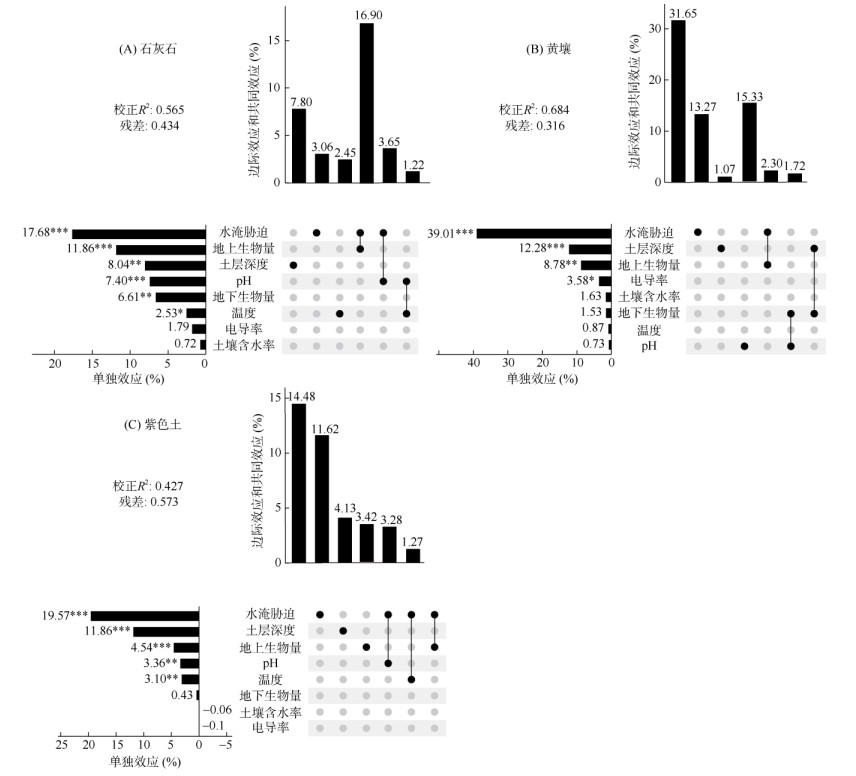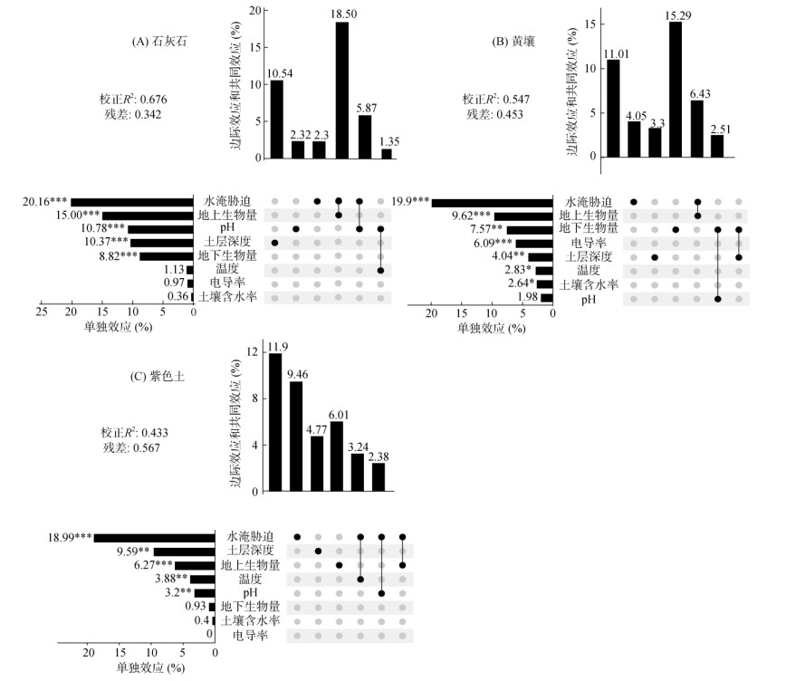 根据RDA(冗余分析)结果,水淹胁迫、地上生物量、土层深度和pH是主导石灰土、黄壤和紫色土有机碳含量变化的主要环境因子。石灰土的有机碳含量被8个环境因子共同解释了67.6%(校正R2 = 0.676)的变异。各因子单独效应的相对重要性排序依次为水淹胁迫(20.16%)、地上生物量(15.00%)、pH(10.78%)、土层深度(10.37%)、地下生物量(8.82%)、温度(1.13%)、电导率(0.97%)、土壤含水率(0.36%)。其中,水淹胁迫与地上生物量具有较大的共同效应(18.50%)(图 3A)。黄壤的有机碳含量由8个因子共同解释了54.7%(校正R²=0.547)的变异。各因子单独效应的相对重要性排序依次为水淹胁迫(19.9%)、地上生物量(9.62%)、地下生物量(7.57%)、电导率(6.09%)、土层深度(4.04%)、温度(2.83%)、土壤含水率(2.64%)、pH(1.98%),水淹胁迫与植物地上生物量具有较大的共同效应(15.29%)(图 3B)。紫色土的有机碳含量被8个环境因子共同解释了43.3%(校正R2 = 0.433)的变异。各因子单独效应的相对重要性排序依次为水淹胁迫(18.99%)、土层深度(9.59%)、地上生物量(6.27%)、温度(3.88%)、pH(3.2%)、地下生物量(0.93%)、土壤含水率(0.4%),水淹胁迫和地上生物量具有最大的共同效应(6.01%)(图 3C)。