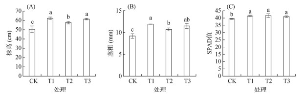 2 结果与分析 2.1 木霉生物有机肥对茄子生长的影响从图 1可以看出,在株高上(图 1A),T1 > T3 > T2 > CK,T1和T3处理显著高于CK和T2处理(P < 0.05);T2处理显著高于CK处理(P < 0.05),T1和T3处理两者相比无明显差异(P > 0.05)。在茎粗上(图 1B),T1 > T3 > T2 > CK,T1、T2和T3均显著高于CK处理(P < 0.05),T1处理显著高于T2处理(P < 0.05);T3和T2处理相比差异未达显著水平(P > 0.05)。在SPAD值上(图 1C),T1、T2和T3处理均显著高于CK处理(P < 0.05)。综上,木霉生物有机肥替代30% 化肥处理的茄子长势与常规施肥基本相当,但其株高和茎粗显著高于常规施肥减施30% 化肥处理。