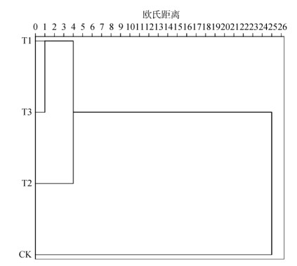 根据不同处理下茄子生长和品质指标的差异,将距离相近的处理聚为一类,从而对不同肥料处理进行分类,如图 2所示,当欧氏距离为4时,4个处理下的茄子按照生长及品质指标可以分为3类:第1类为CK处理,株高、茎粗和产量最低;第2类为T2处理,其可溶性糖、可溶性蛋白和VC含量较高;第3类为T1处理和T3处理,T1处理生长指标好,有最高的株高、茎粗和产量,T3处理品质指标优异,可溶性糖、可溶性蛋白和VC含量最高,两者综合评价得分相近。