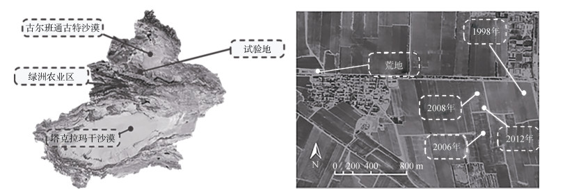 1 材料与方法 1.1 研究区概况研究区位于下野地灌区121团6连(85°33′E ~ 85°35′E,44°48′N ~ 44°50′N)(图 1)。选取不同滴灌年限棉田5块:滴灌起始年限为1998年(21 a)、2006年(13 a)、2008年(11 a)、2012年(7 a)和荒地(0 a)。试验地块在开垦前均为盐碱荒地,土质以壤质为主,地下水埋深年内变化范围在2 ~ 4 m,地下水的补充主要依靠地表径流入渗。平均海拔337 m,年平均降水量142 mm,年均蒸发量1 826 mm,属于典型的温带大陆性气候,冬季气温相对低且维持时间长,夏季气温高且蒸发旺盛。年平均气温6.2 ℃,7月份平均最高气温为27.7 ℃,极端最高气温达43 ℃,1月份平均最低气温为–16 ℃,极端最低气温达–36 ℃。该地区光热资源丰度,年均日照时数2 860 h,无霜期平均163 d。大于0 ℃年平均积温4 181.2 ℃,大于10 ℃年平均积温3 792.6 ℃。