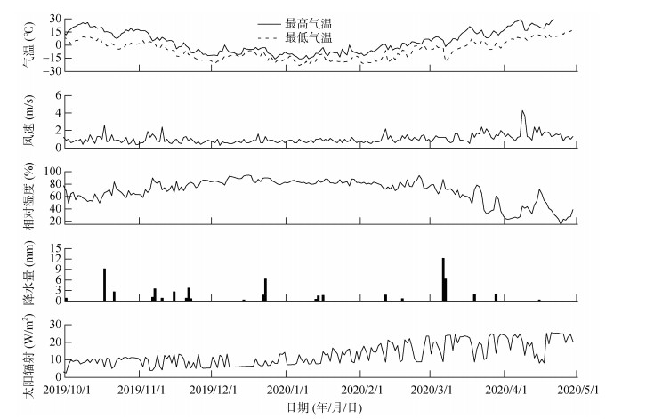 土壤温度采用自存储式温度传感器(179-DTDTH,Apresys,美国)监测,传感器每2 h采集并记录一次数据,传感器埋设深度与土钻取样深度保持一致。研究区气象数据最高气温、最低气温、露点温度、风速、降水量及太阳辐射等由炮台镇气象局提供(图 2)。