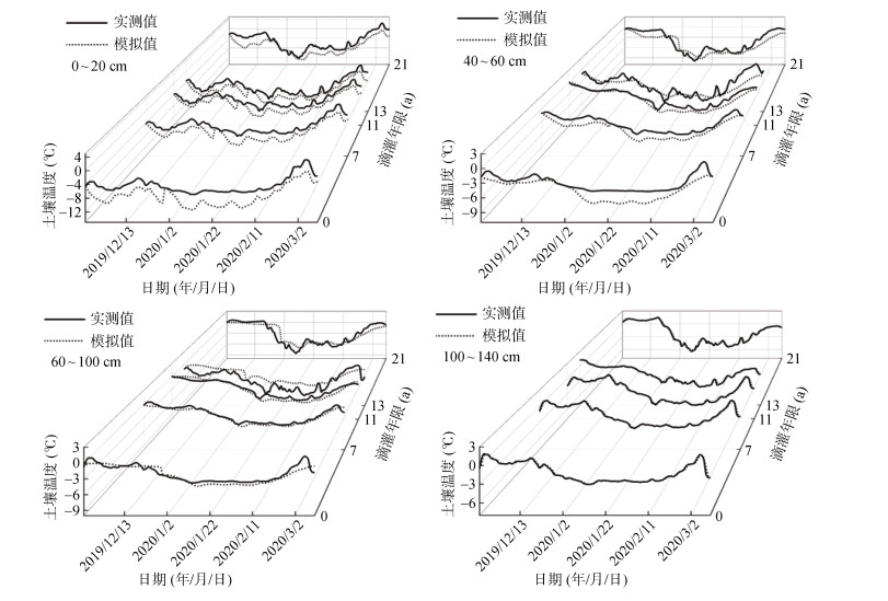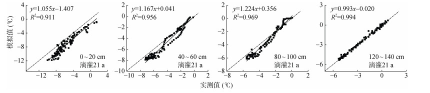 冻融循环过程中,温度是土壤冻结和融化的主导因素。以0 ~ 20、40 ~ 60、80 ~ 100和120 ~ 140 cm深度的土壤参数为代表进行对比(图 6),同一土层不同滴灌年限棉田土壤温度的模拟值与实测值变化趋势基本一致,且随土层深度增加模拟效果越好。表层和中间层土壤稳定冻结期模拟效果相对较好;深层土壤各时期模拟效果基本一致。整个冻融期,随滴灌年限增加温度变化幅度越大,剖面温度变化过程呈现“U”形分布,冻结期开始温度平滑下降,进入解冻时期表层地温迅速升高。