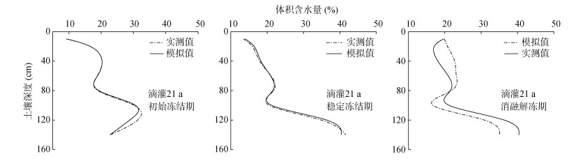 为比较连续土层土壤水分模拟效果变化情况,随机选择初始冻结期、稳定冻结期及消融解冻期某一日土壤剖面实测值和模拟值进行比较(图 4),结果表明不同冻融期土壤水分模拟值与实测值变化趋势基本一致,能够反映土壤冻融期的变化规律。