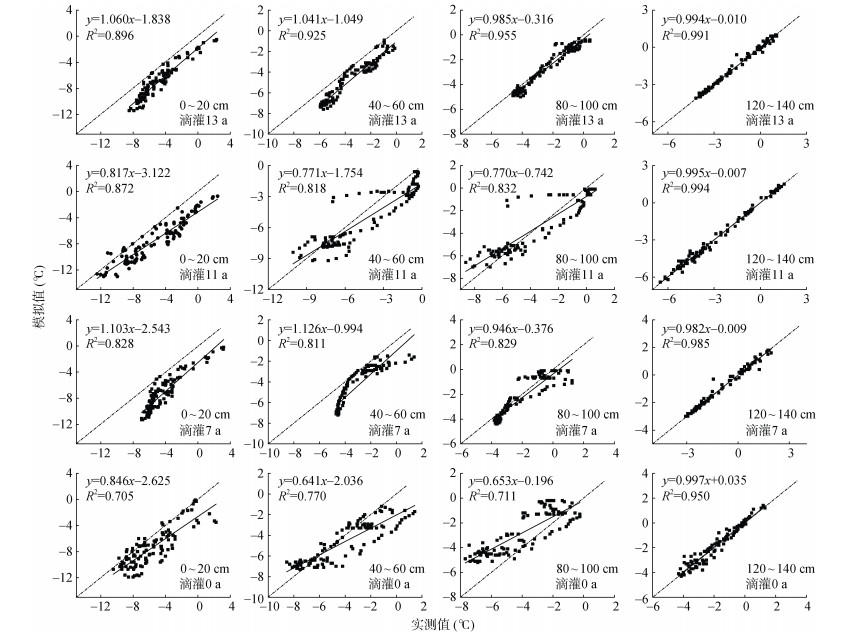 图 7 不同滴灌年限不同土层土壤温度验证结果对比 Fig. 7 Validation results of soil temperatures in different soil layers with different drip irrigated years |