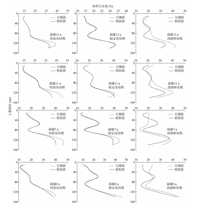 3.2.2 土壤水分验证模拟效果评估为比较不同滴灌年限连续土层土壤水分模拟效果,随机选择初始冻结期、稳定冻结期及消融解冻期某一日土壤剖面实测值和模拟值进行比较。结果(图 8)表明整个冻融期不同时间土壤水分模拟值与实测值变化趋势基本一致,能够反映不同滴灌年限土壤冻融期的变化规律。稳定冻结期模拟效果最佳,消融解冻期模拟效果最差。土壤深度在120 cm之下的模拟效果稍差,初始冻结期表层模拟效果较深层模拟效果好。