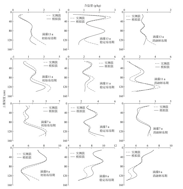3.2.3 土壤盐分验证模拟效果评估图 9展示了土壤盐分动态在不同滴灌年限及不同冻融时期(初始冻结期、稳定冻结期及消融解冻期)所得到的模拟效果。结果表明,稳定冻结期模拟效果最佳,消融解冻期模拟效果最差。稳定冻结期土壤深度在120 cm之下的模拟效果稍差,荒地在稳定冻结期时80 cm之下的模拟效果稍差,0 ~ 40 cm土层深度的土壤含盐量随着土壤冻融过程呈先上升后下降的趋势,表层的盐分变化较大,变化现象较明显。土壤深度80 ~ 100 cm的土壤盐分变化较小。