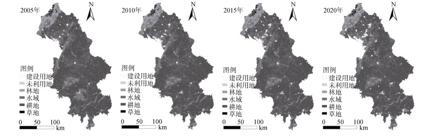 2.2 数据来源影像数据选取地理空间数据云平台(http://www.gscloud.cn/)2005年、2010年、2015年、2020年Landsat TM/ETM的遥感影像,分辨率30 m,卫星影像云量均小于5%。采用ENVI5.1软件对影像进行辐射定标、大气校正、影像融合等处理;以研究区1∶50 000地形图为基准对影像进行几何精纠正,误差控制在0.5像元以内[18];分类标准为中科院土地利用覆被变化(LUCC)分类体系[19],具体数据处理流程依据参考文献[20],分为耕地、林地、草地、水域、城乡建设用地和未利用地6种类型(图 2);采用高分辨率遥感影像对解译后的数据进行验证,总体精度大于95%。本研究所用的沱江流域数字高程模型数据来源于中国科学院计算机网络信息中心科学数据中心,空间分辨率为30 m。