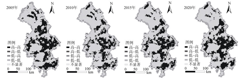 图 3 沱江流域2005—2020年土地利用生态风险值LISA聚类图 Fig. 3 LISA cluster maps of land use ecological risk values in Tuojiang River Basin from 2005 to 2020 |