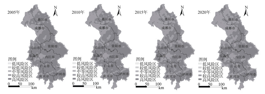 图 4 沱江流域2005—2020年土地利用生态风险空间分布图 Fig. 4 Spatial distribution of land use ecological risks in Tuojiang River Basin from 2005 to 2020 |