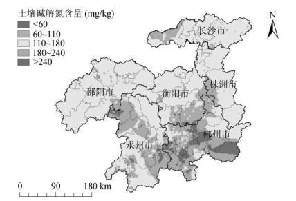 2 结果与分析 2.1 植烟水稻土碱解氮含量分布特征 2.1.1 市域分布统计由表 1可知,湖南植烟水稻土碱解氮含量在57.10 ~ 447.40 mg/kg,“适宜”样本比例最高,为46.55%;其次是“高”样本(34.77%),“极低”和“低”样本比例均低于5%。从不同地级市看,各市碱解氮含量平均值在154.76 ~ 202.98 mg/kg,以郴州市最高(202.98 mg/kg),邵阳市最低(154.76 mg/kg)。各市碱解氮含量在“适宜”的分布频率为32.51% ~ 70.77%,以郴州市最低,株洲市最高;在“高”的分布频率为18.46% ~ 41.52%,以株洲市最低,郴州市最高;在“很高”的分布频率为0.85% ~ 23.03%,以长沙市最低,郴州市最高。可见,湖南稻作烟区植烟土壤碱解氮含量高,并且在不同地级市间差异较大。