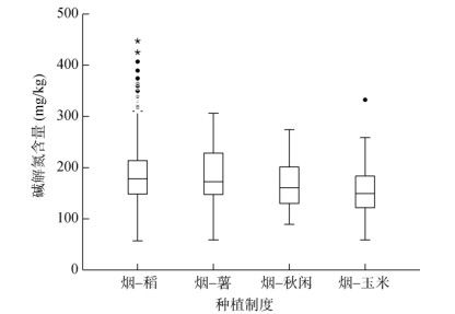 湖南植烟水稻土目前主要种植制度是烟-稻、烟-薯、烟-秋闲(春季种烤烟,秋天不种其他作物)和烟-玉米4类,其土壤碱解氮含量的均值分别为184.08、184.19、164.81和154.96 mg/kg,大小排序为:烟-薯 > 烟-稻 > 烟-秋闲 > 烟-玉米。烟-稻和烟-薯的土壤碱解氮含量为“高”,烟-秋闲和烟-玉米的为“适宜”;烟-稻和烟-薯的土壤碱解氮含量显著高于烟-玉米,这可能与水稻施氮量较高(烟-稻)和甘薯耗氮量较少(烟-薯)有关。