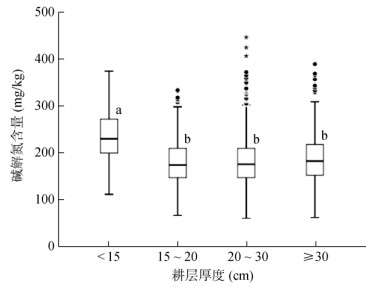 2.2.2 耕层厚度由图 4可知,按 < 15、15 ~ 20、20 ~ 30和≥30 cm将耕层厚度分为4级,其土壤碱解氮含量分别为232.61、179.00、180.35和185.70 mg/kg,大小排序依次为 < 15、≥30、20 ~ 30和15 ~ 20 cm。耕层厚度 < 15 cm,土壤碱解氮属于“高”;而相对含量最低的15 ~ 20 cm土壤碱解氮含量也在“适宜”的范围内。< 15 cm的土壤碱解氮含量显著高于其他耕层厚度,这可能与土壤碱解氮易于表层富集有关。