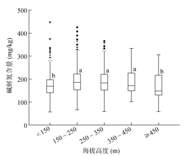 由图 5可知,将海拔分为 < 150、150 ~ 250、250 ~ 350、350 ~ 450以及≥450 m 5级,其土壤碱解氮含量平均值分别为172.40、190.72、188.08、188.89和169.67 mg/kg,由高到低为150 ~ 250、350 ~ 450、250 ~ 350、< 150和≥450 m。海拔在150 ~ 450 m的土壤碱解氮含量为“高”;< 150 m和≥450 m的土壤碱解氮含量为“适宜”;150 ~ 250、250 ~ 350和350 ~ 450 m的土壤碱解氮含量显著高于 < 150 m和≥450 m。随海拔升高,土壤碱解氮含量呈先升后降的趋势(y = –9.076ln(x) + 246.42, R2 = 0.030 3, P < 0.05)。