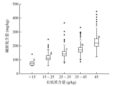 图 7 不同有机质含量的植烟水稻土碱解氮含量 Fig. 7 AN contents in tobacco-planting paddy soils with different organic matter contents |