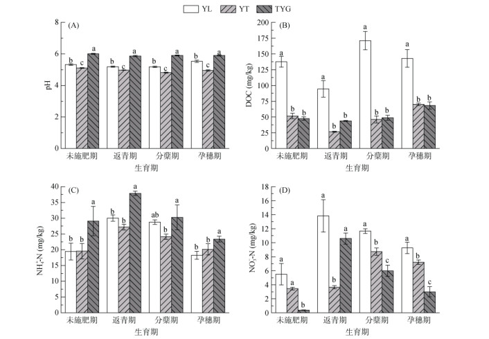 2 结果与分析 2.1 不同母质发育稻田土壤理化性质的差异早稻生育期间3种母质发育稻田土壤理化性质存在显著差异(图 1)。3种土壤的pH在4个时期一直呈酸性,均表现为:TYG > YL > YT。YL土壤DOC含量显著高于YT与TYG(P < 0.05)。TYG土壤的NH4+-N含量在各生育期显著高于YT与YL(P < 0.05)。YL土壤NO3--N含量在分蘖期和孕穗期显著高于其他处理(P < 0.05)。