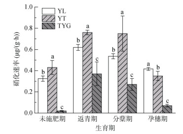1 材料与方法 1.1 供试样点及样品采集中国科学院桃源农业生态试验站原状水稻土易地置土长期定位试验设置于2010年底,是将广东英利的砖红壤、浙江嘉兴和湖南桃源古市的河流冲积物、江西鹰潭和湖南桃源宝洞峪的第四纪红壤母质发育的5种水稻土置于桃源农业生态试验站的同一田块(各含3个重复)。每个微区的原状土柱长×宽×高为1.4 m×1.4 m×0.7 m。2011年至今,按照当地水稻种植模式种植双季稻。稍有调整的是,为了防止原状土柱开裂造成养分流失等问题,本长期定位试验一直淹水处理。本研究在2018年早稻种植期间选取了该长期定位试验田中广东英利的砖红壤(YL)(20°33′ N,110°04′ E)、江西鹰潭的第四纪红壤(YT)(28°12′ N,116°56′ E)和湖南桃源古市的河流冲积物(TYG)(28°55′ N,111°26′ E)3种母质发育土壤作为研究对象。2018年测得YL土壤基本理化性质为:全氮1.06 g/kg、全磷1.04 g/kg、全钾4.24 g/kg、有机质20.25 g/kg;YT土壤基本理化性质为:全氮1.21 g/kg、全磷0.71 g/kg、全钾15.4 g/kg、有机质22.15 g/kg;TYG土壤基本理化性质为:全氮2.15 g/kg、全磷0.72 g/kg、全钾22.67 g/kg、有机质18.82 g/kg。3种土壤于4月28日按每亩(1亩=667 m2)施入25 kg过磷酸钙(含P2O5 120 g/kg)、5 kg氯化钾(含K2O 600 g/kg)、11.5 kg尿素(含N 460 g/kg)后移栽早稻(品种为中早35),并于5月4日按每亩施入8 kg尿素进行追肥。分别在4月26日未施肥期、5月6日水稻返青期、5月20日分蘖期和6月4日孕穗期采集土样。每小区选取前中后三段,每段采用五点取样法采集土样(0 ~ 20 cm)后混匀,每个时期各取3个重复。去除土壤中杂草、石块等杂质,一部分立即用于理化性质和硝化速率测定,另一部分储存在–80℃冰箱用于分子生物学指标测定。