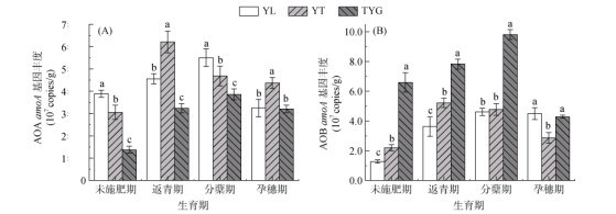 图 3 不同母质发育稻田土壤水稻各生育期AOA(A)和AOB(B)基因丰度 Fig. 3 Abundance of AOA(A) and AOB(B) of paddy soils derived from different parent materials during different rice growth stages |