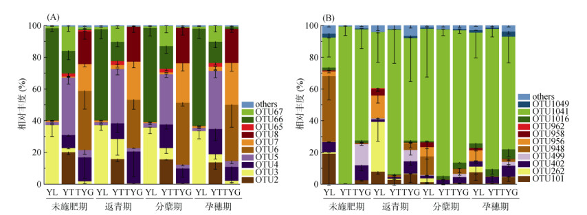 图 4 不同母质发育稻田土壤各生育期AOA(A)和AOB(B)群落组成 Fig. 4 Community compositions of AOA (A) and AOB (B) in paddy soils derived from different parent materials during different rice growth stages |