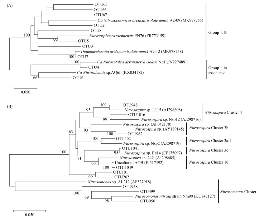 图 5 AOA(A)、AOB(B)优势OTU系统发育树 Fig. 5 Phylogenetic tree of dominant OTUs of AOA(A)and AOB(B) |