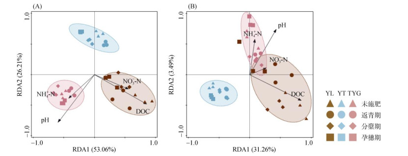 3.2 不同母质发育稻田土壤对硝化微生物群落组成的影响本研究发现,不同母质发育稻田土壤AOA、AOB多样性指数、群落组成均存在显著差异。其中AOA优势菌属各不相同,YT土壤中,AOA优势菌属为Nitrososphaera(亚硝化螺菌属)。研究发现发现,Nitrososphaera是酸性土壤中氨氧化作用的重要驱动者[5, 24],这可能是因为其具备一种独特的代谢能力,可缓解pH较低环境对其的毒害作用。Nitrosotenuis (细小亚硝化菌属)主要在河流、河口和深水湖泊分布[25],这与本研究中同为河流冲积物母质的TYG土壤优势菌属结果一致,同时Thaumarchaeota(奇古菌门)在酸性土壤中也广泛分布[26]。在相同种植环境背景下,3种不同母质发育稻田土壤AOA优势菌属各不相同,这也充分体现了母质对AOA群落结构存在显著影响以及酸性土壤氨氧化过程的复杂性和氨氧化微生物的多样性。β变形菌门被认为在土壤AOB中占主导地位,其中两个主要类群为 Nitrosomonas(亚硝化单胞菌属)和Nitrosospira(亚硝化螺旋菌属)。Nitrosospira更偏好酸性土壤[27],是酸性土壤中的优势菌属,本研究结果与也之相符合。Nitrosomonas在酸性土壤中很少见,通常分布于中性或碱性土壤中[6, 27],这也是它在本研究3种酸性土壤中占比较少的原因。RDA分析结果表明,pH和DOC含量是驱动氨氧化微生物AOA、AOB群落结构的关键因子,其中DOC影响较大。有研究发现,土壤pH可以通过改变氨的生物有效性来影响氨氧化微生物的群落结构[28],且不同pH环境条件下,AOA、AOB主要功能类群也不同[5-8]。宋延静等[20]也认为土壤pH对稻田氨氧化菌群落结构的形成起着重要作用。Marschner[29]发现细菌群落结构受土壤有机碳含量的显著影响,这可能是由于DOC中容易分解的化合物如有机酸和碳水化合物可能主要被土壤细菌利用的结果。这说明即使在相同的种植环境背景下,由地域和成土母质因素长期影响所造成的土壤理化性质及养分的差异,仍然会导致AOA、AOB群落组成结构的不同,说明母质显著影响氨氧化微生物群落结构组成。
