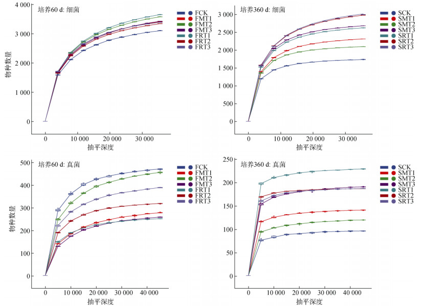 1.4 数据处理采用SPSS 25.0进行数据的统计分析,采用单因素和多因素方差分析和Duncan法多重比较进行处理间差异显著性检验。采用派森诺基因云平台(https://www.genescloud.cn/)进行分类学组成分析、多样性分析等,具体如下:使用QIIME2 (2019.4),通过https://view.qiime2.org/,实现稀疏曲线的可视化;自编perl脚本等,调用“qiime taxa barplot”命令,进行物种组成堆叠柱状图的绘制。使用R语言ggplot2包进行α多样性指数分析;vegan包等对Bray-curtis距离矩阵(默认)进行非度量多维尺度分析(Non-metric multidimensional scaling analysis, NMDS)分析;物种组成热图使用R脚本计算各样本以及各分类单元的聚类结果,pheatmap包绘制热图。