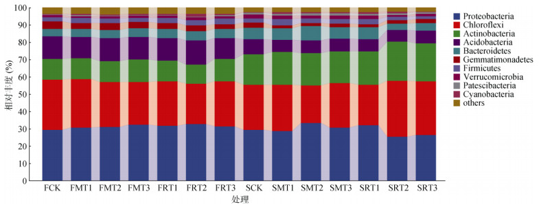 如表 4所示,培养60 d时,在玉米秸秆生物质炭处理中,细菌的5个指标均在FMT2处理下最大。整体上,除Simpson指数外,各指标均随着生物质炭裂解温度的升高表现为增加趋势。培养360 d后,细菌在玉米秸秆生物质炭处理中,SMT3处理各指数均高于SMT1和SMT2处理,其中Simpson指数差异显著(P < 0.05);在水稻秸秆生物质炭处理中,SRT1处理只有序列数最大,其他各指标均为最低。对比两个培养时期不同原材料生物质炭,发现细菌的序列数FCK、FR处理显著小于SR处理;丰富度和多样性4个指数在各处理间变化趋势一致:生物质炭处理均高于CK处理,其中FCK > SCK,FM > SM,且均有显著差异(P < 0.05)(表 4)。多因素方差分析表明,各多样性和丰富度指数的主效应在培养时间上均极显著,生物质炭种类和培养时间的交互效应也显著。