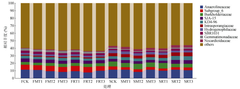 两个培养时期各处理细菌科水平数量平均分别为307科和275科,与FCK(292科)、SCK(232科)处理相比,玉米和水稻秸秆生物质炭处理60 d时分别增加了14科和17科,360 d时分别增加了37科和53科。如图 3所示,各处理细菌科水平的种类多且相对丰度均较小,但厌氧绳菌科(Anaerolineaceae)的相对丰度达7.67% ~ 11.41%,培养60 d时FCK处理的相对丰度高于其他处理,培养360 d时相对丰度最高的是SMT2处理,SCK处理次之(图 3)。除厌氧绳菌科外,相对丰度最大的为FRT2处理中的Subgroup_6,其相对丰度为7.30%。两个培养时期相对丰度前10位的菌科之和分别占所有细菌科相对丰度的37.61% 和41.41%。对比两个培养时期,相对丰度差异较大的为Subgroup_6、伯克氏菌科(Burkholderiaceae)和间孢囊菌科(Intrasporangiaceae),其中,Subgroup_6的相对丰度相较前一个时期减少了48.37%,伯克氏菌科增加了54.86%,间孢囊菌科的增加量达到了187.41%。(图 3)。