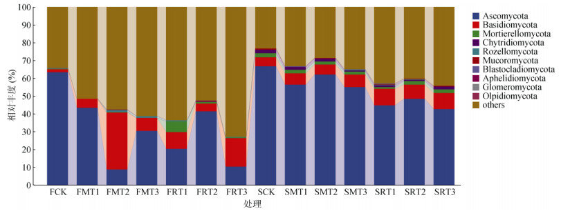 无论是水稻秸秆生物质炭还是玉米秸秆生物质炭处理,所有样品中检测到除未分类的真菌和未知的真菌外,共检测到12个真菌门类,各处理3 ~ 8个不等,且每个处理中均有子囊菌门(Ascomycota)和担子菌门(Basidiomycota)(图 4)。另外,培养360 d时,每个处理中均含有壶菌门(Chytridiomycota)和毛霉门(Mucoromycota)。两个培养时期中子囊菌门在各处理中的相对丰度均小于CK处理。子囊菌门在培养60 d时的水稻秸秆生物质炭处理和培养360 d的两种生物质炭处理中均呈现以下规律:FRT2 > FRT1 > FRT3;SMT2 > SMT1 > SMT3;SRT2 > SRT1 > SRT3,总体的相对丰度大小为:FR > SR > SM。