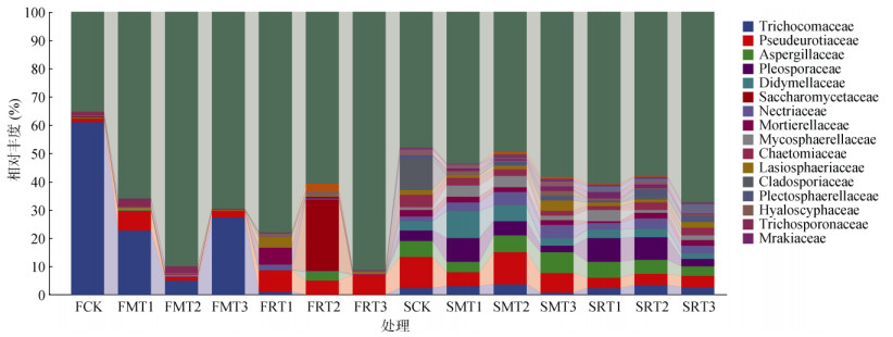 除未在科水平上分类及未知的真菌之外,共检测出225个真菌科,每个处理9 ~ 52个不等。图 5为相对丰度前20位的科水平真菌物种分布堆叠图。由图 5可知,发菌科(Trichocomaceae)在培养60 d时在FCK(61.07%)、FMT1(22.68%)、FMT3(27.29%)3个处理中相对丰度占比较大;而酵母科(Saccharomycetaceae)在FRT2处理中处于极大的优势,相对丰度为25.64%;枝孢霉科(Cladosporiaceae)出现在SCK、SRT2、SRT3处理中,相对丰度分别为11.19%、1.41%、0.24%。总体上,培养360时(各处理真菌平均科数量为27个)相对丰度前20位的真菌科数量较多且较培养60 d时(平均科数量为17)更为均匀。